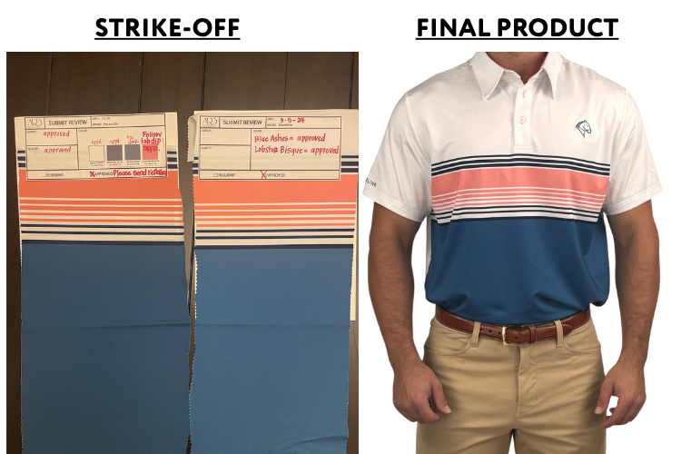 A strike-off (or hand loom, for wovens) is a pre-production sample of your graphic, print, or pattern — applied to the correct fabric, using the final print technique, and executed in your requested colors.